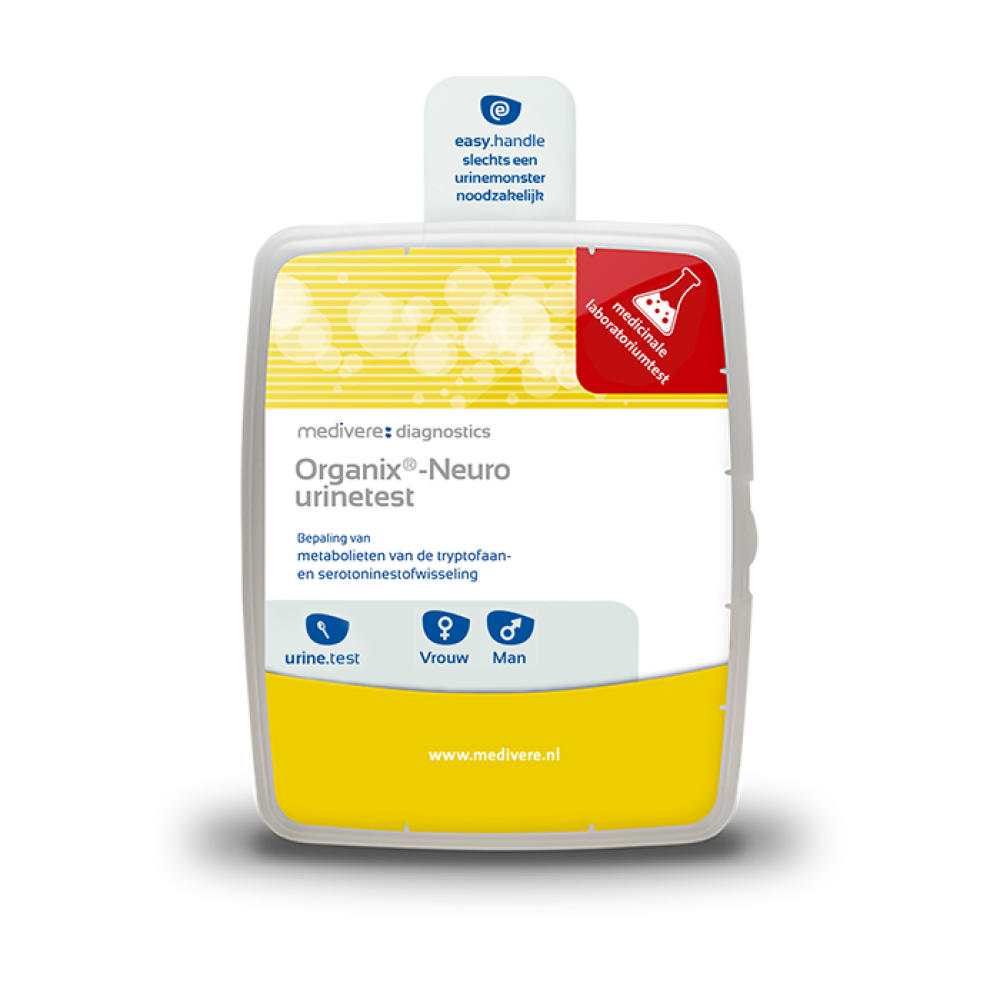 Met de Organix®-Neuro urinetest heeft u de beschikking over een gevoelige massaspectrometrische methode. Deze kan zinvol worden ingezet bij alle somatische (lichamelijke) ziektes met begeleidende psychische aandoeningen. Uit een verscheidenheid van klinische en biochemische gegevens blijkt dat het essentiële aminozuur tryptofaan de “missing link” is tussen de somatische en psychiatrische stoornissen. Tryptofaan is een essentieel aminozuur dat bij fysiologische omstandigheden in de neurohormonen serotonine en melatonine omgezet word. Het gevormde serotonine heeft een positieve invloed op de stemming (als antidepressivum), werkt pijnstillend en ontspannend. In het maagdarmkanaal heeft serotonine invloed op de motiliteit, secretie en pijnbeleving. Tryptofaanafbraak treedt fysiologisch op door hepatische tryptofaan- 2,3-dioxygenase (TDO) via de oxidatieve kynureninestofwisseling.